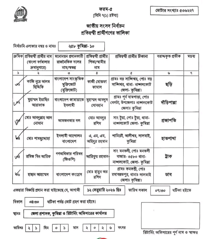 দেখে নিন কুমিল্লা-১০ আসনে কে কোন প্রতীক পেয়েছেন